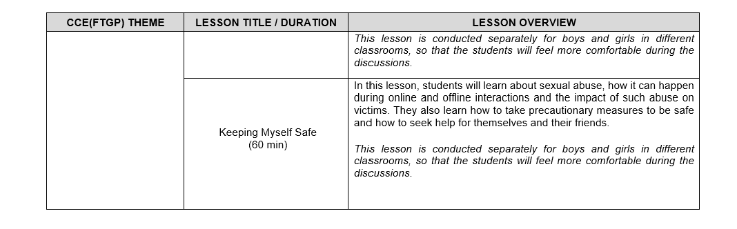 7. Sexuality Education (SEd) lessons are taught as part of CCE (FTGP) at Primary 5 and 6. Through these lessons, students will learn healthy ways to manage the physiological, social and emotional changes in their growing years. They learn to build healthy and rewarding relationships with others, including those with members of the opposite sex. Students are also guided to make wise, informed and responsible decisions to keep themselves safe from sexuality-related risks.